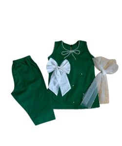 Girls’ Green & White Bow Dress Set with Headband