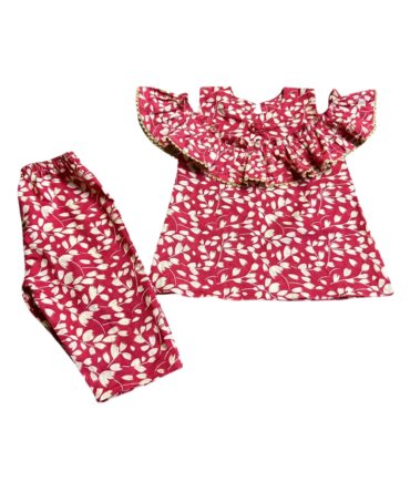 Red & Cream Leaf Print Ruffle Top with Matching Trousers