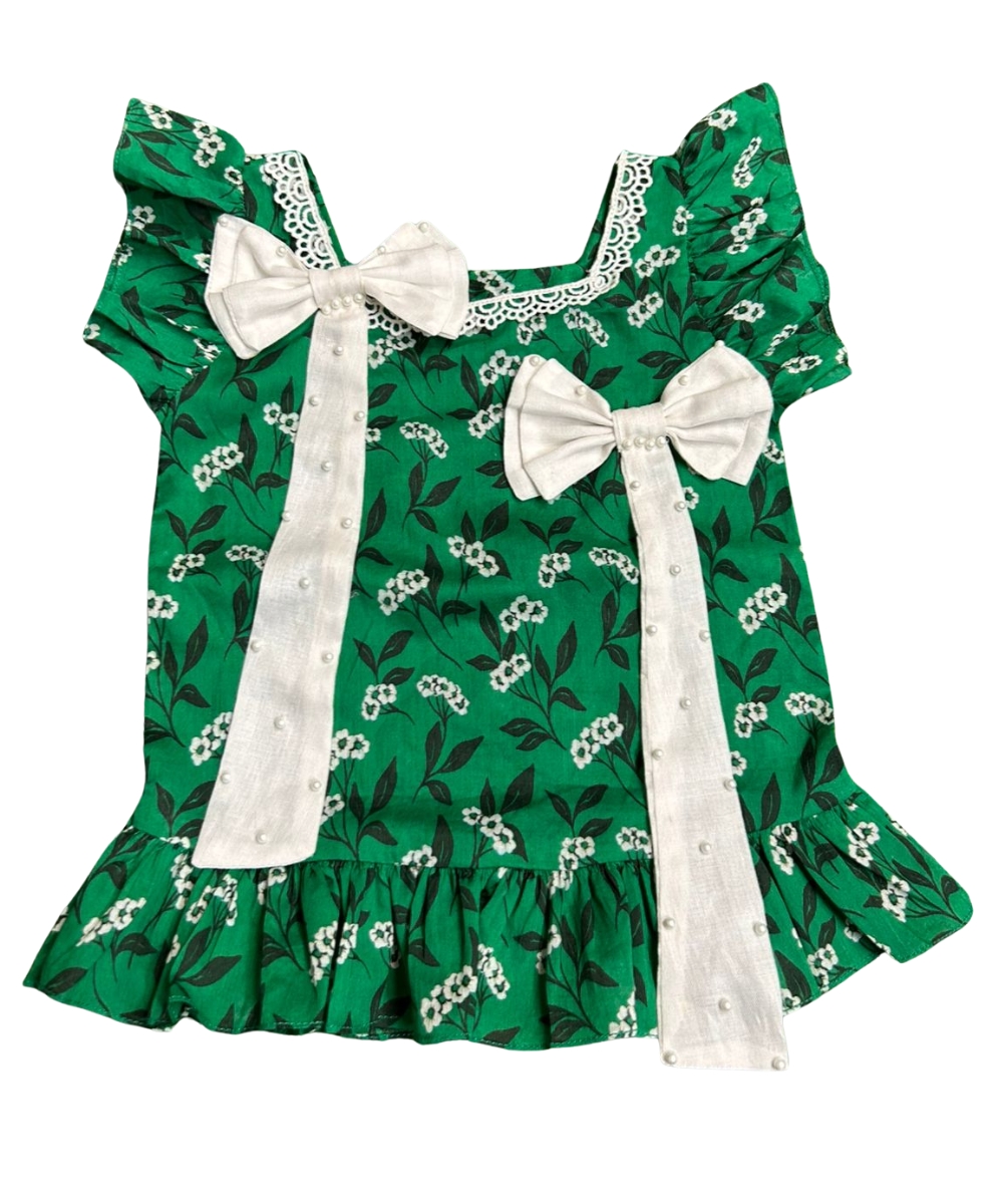 This stylish and elegant outfit is a must-have for your little girl’s wardrobe. Designed for 3–4-year-old girls, the set features a vibrant green floral top with a fresh botanical print that brings out a cheerful and trendy vibe. The top is beautifully enhanced with two large white bows, delicate lace detailing around the neckline, and pearl-embellished vertical strips, adding a touch of sophistication to the playful design. The ruffled hem gives the top a unique and fashionable flair, making it stand out as a stylish choice for any occasion.