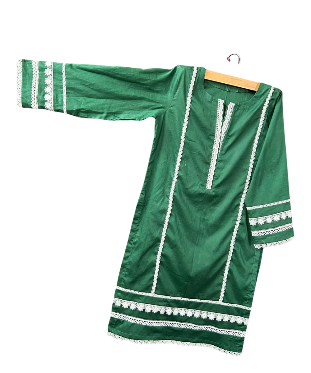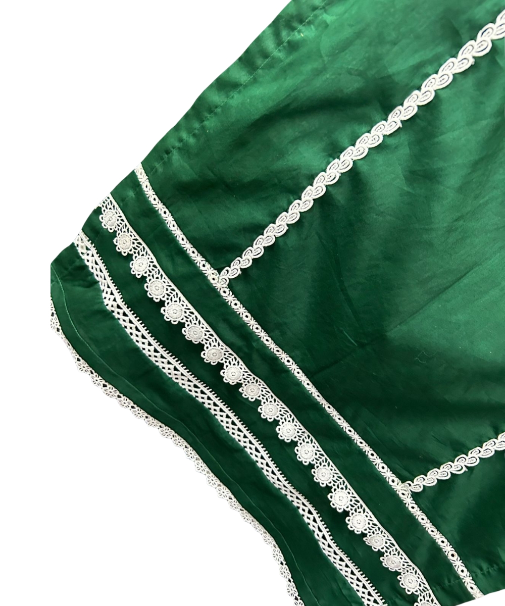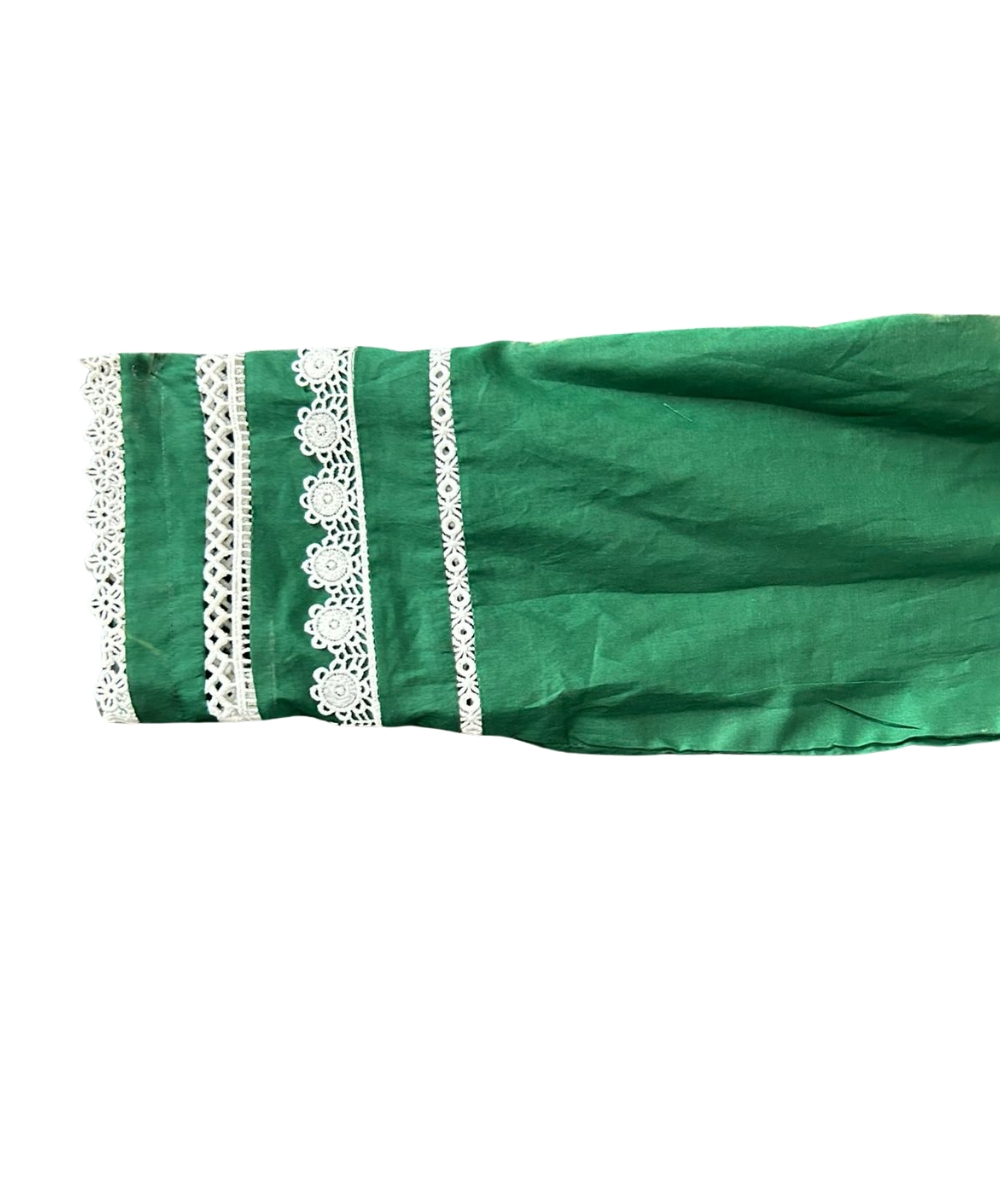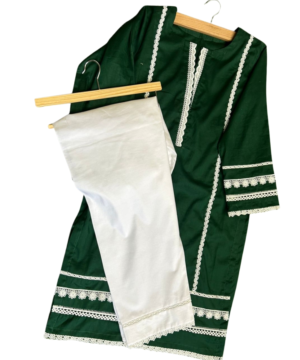 Color & Design: Deep green kameez with elegant white lace detailing on neckline, sleeves, and hem.