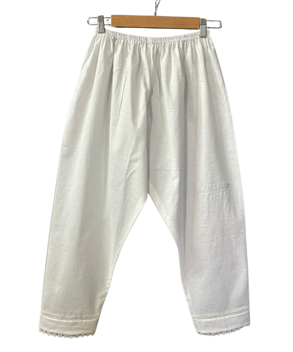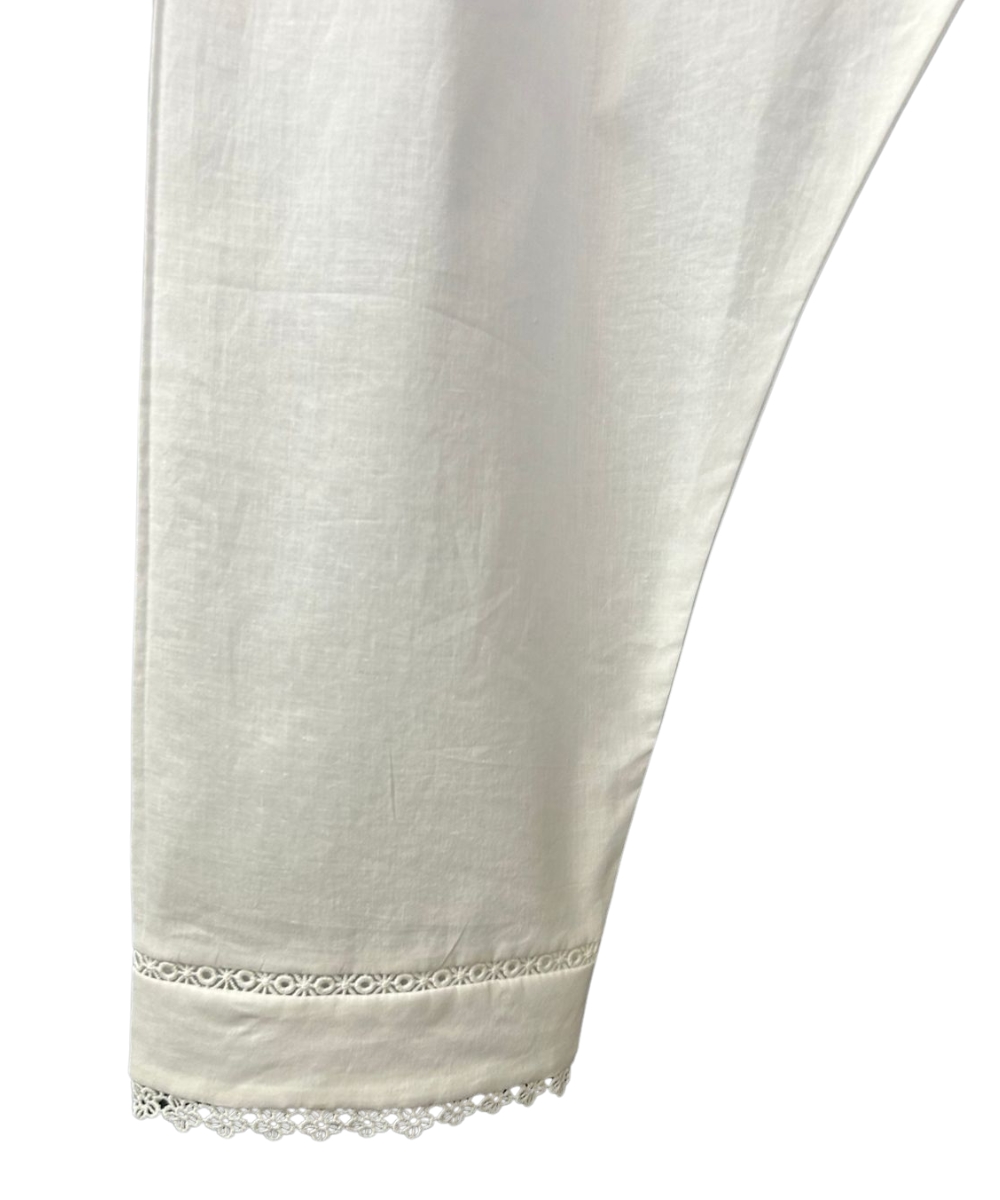 Trousers: White straight-fit pants with lace border for a matching, polished look.