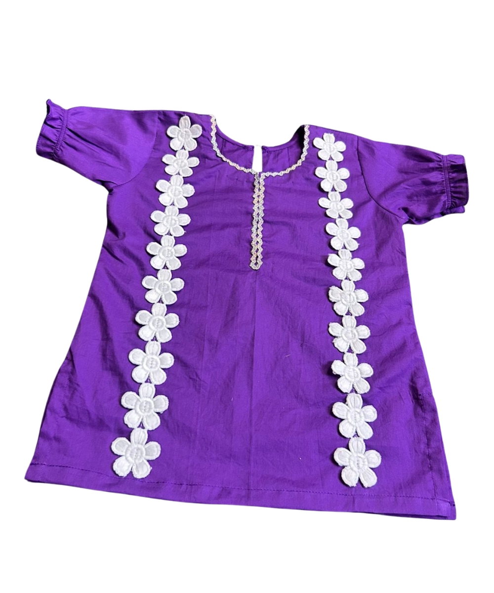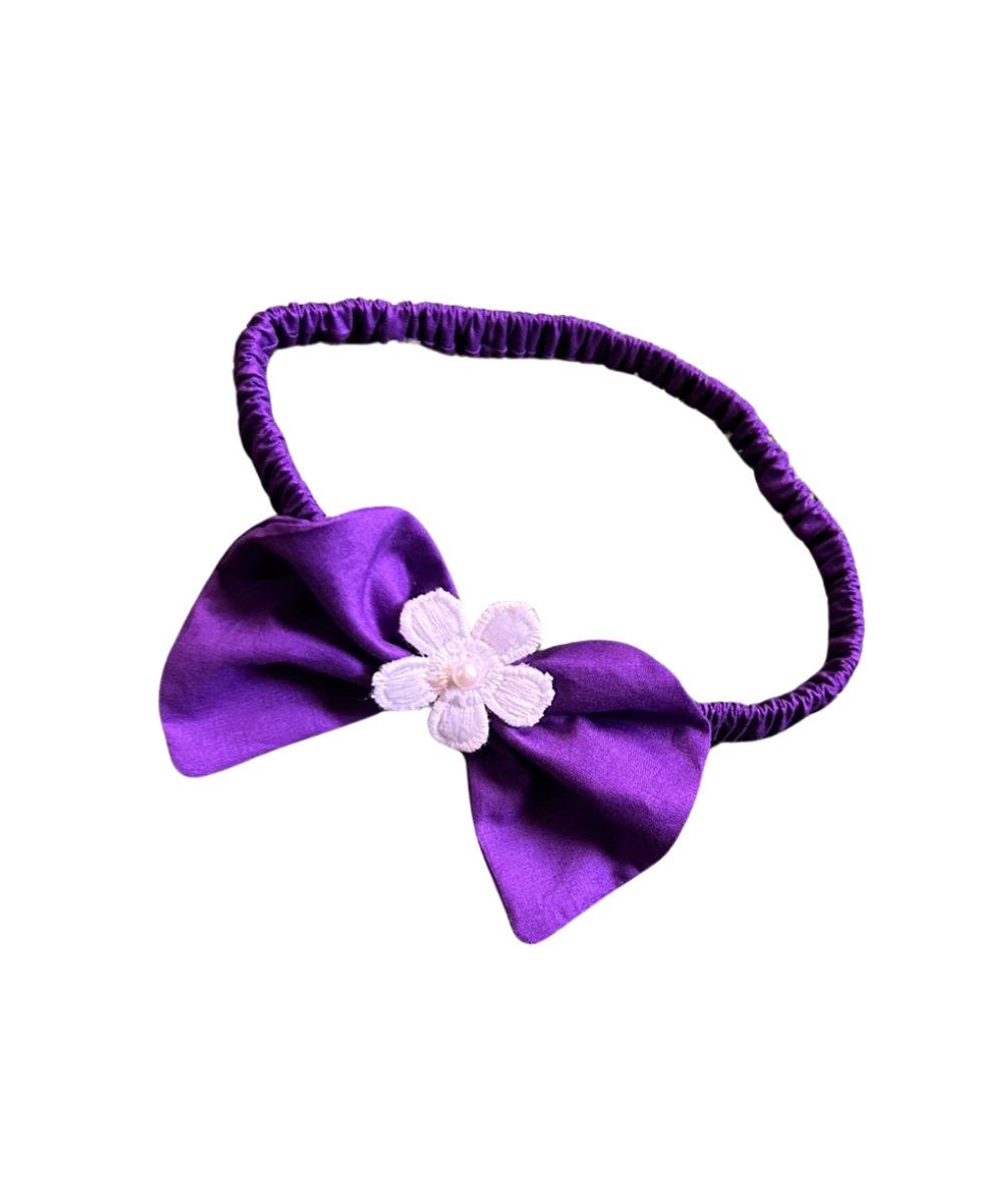 Hairband: Matching purple fabric hairband with center pe white embroidered flower and pearl detail.