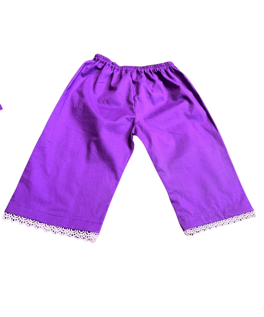 Trouser: Loose-fit capri style, same purple fabric, trouser ke bottom hem pe white lace trim.